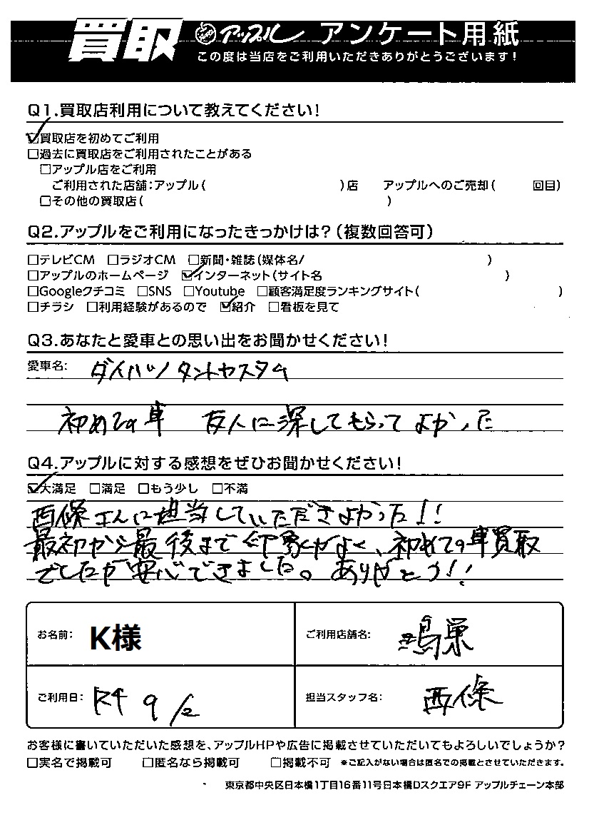 最初から最後まで印象がよく、初めての車買取でしたが安心できました。