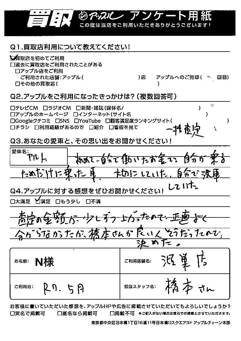 査定の金額が少しずつ上がったので正直よくわからなかったが、橋本さんが良い人そうだったので決めた。