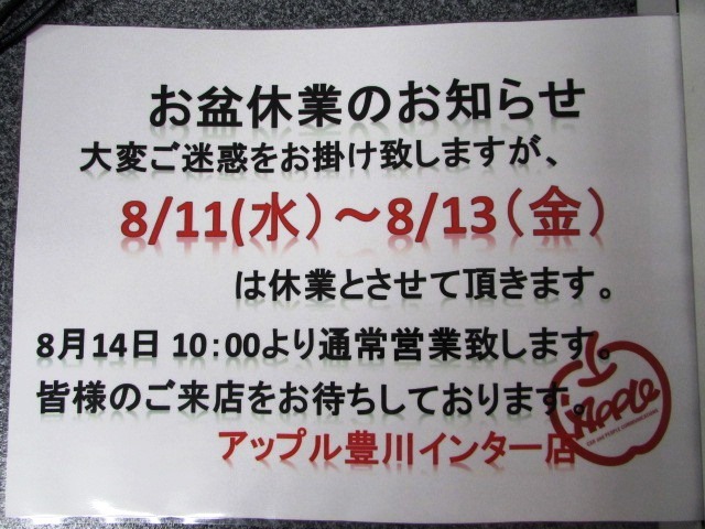 お車のご相談・ 査定だけでもOK! カンタン 入力 30秒 アップルがブランド買取始めました! お電話でも受付中! 受付時間10:00 ~ 19:00 0533-89-9777 お車のご相談・ 査定だけでもOK! カンタン 入力 30秒 アップルがブランド買取始めました! お電話でも受付中! 受付時間10:00 ~ 19:00 0533-89-9777 アップルがブランド買取始めました! お電話でも受付中! 受付時間10:00 ~ 19:00 0533-89-9777 店舗情報 在庫車 スタッフ紹介 ブログ お客様の声 キャンペーン お得 無料査定 click [ つぶやき ] 2021/08/09 (月) 10:00 お盆休みにそろそろ入ります オリンピックも終わりましたね。暦の上ではもう秋・・・8月11日から13日がお盆休みになります。ご迷惑をおかけしますが、どうぞよろしくお願いいたします。8月14日から気合入れて営業いたします。夏バテにならないように、熱中症にならないように、皆様お気を付けください。アデュー 2021-08-09 10:00:00 新しい記事へ 古い記事へ 最新記事 No.1獲得記念キャンペーン半年に一度のいまだけ!!いいものもらえる!!感謝還元キャンペーン半年に1度の「ビッグ~!チャンス」 新アップル豊川インター店、誕生… 店舗情報に戻る 月別アーカイブ 2026年01月(1)2025年09月(1)2025年01月(1)2024年09月(1)2024年06月(2)2024年05月(3)2023年12月(2)2023年11月(3)2023年10月(2)2023年09月(5)2023年08月(4)2023年07月(4)2023年01月(1)2022年10月(2)2022年09月(2)2022年08月(3)2022年07月(4)2022年06月(4)2022年05月(5)2022年04月(4)2022年03月(4)2022年02月(4)2022年01月(5)2021年12月(4)2021年11月(5)2021年10月(4)2021年09月(4)2021年08月(5)2021年07月(4)2021年06月(3)2021年05月(4)2021年04月(4)2021年03月(5)2021年02月(4)2021年01月(5)2020年12月(6)2020年11月(5)2020年10月(4)2020年09月(6)2020年08月(6)2020年07月(5)2020年06月(5)2020年05月(7)2020年04月(7)2020年03月(4)2020年02月(7)2020年01月(10)2019年12月(10)2019年11月(9)2019年10月(10)2019年09月(6)2019年08月(7)2019年07月(9)2019年06月(6)2019年05月(9)2019年04月(11)2019年03月(10)2019年02月(7)2019年01月(8)2018年12月(4)2018年11月(1)2018年09月(1)2018年07月(1)2018年05月(1)2018年04月(1)2018年01月(2)2017年12月(3)2017年09月(1)2017年07月(1)2017年05月(1)