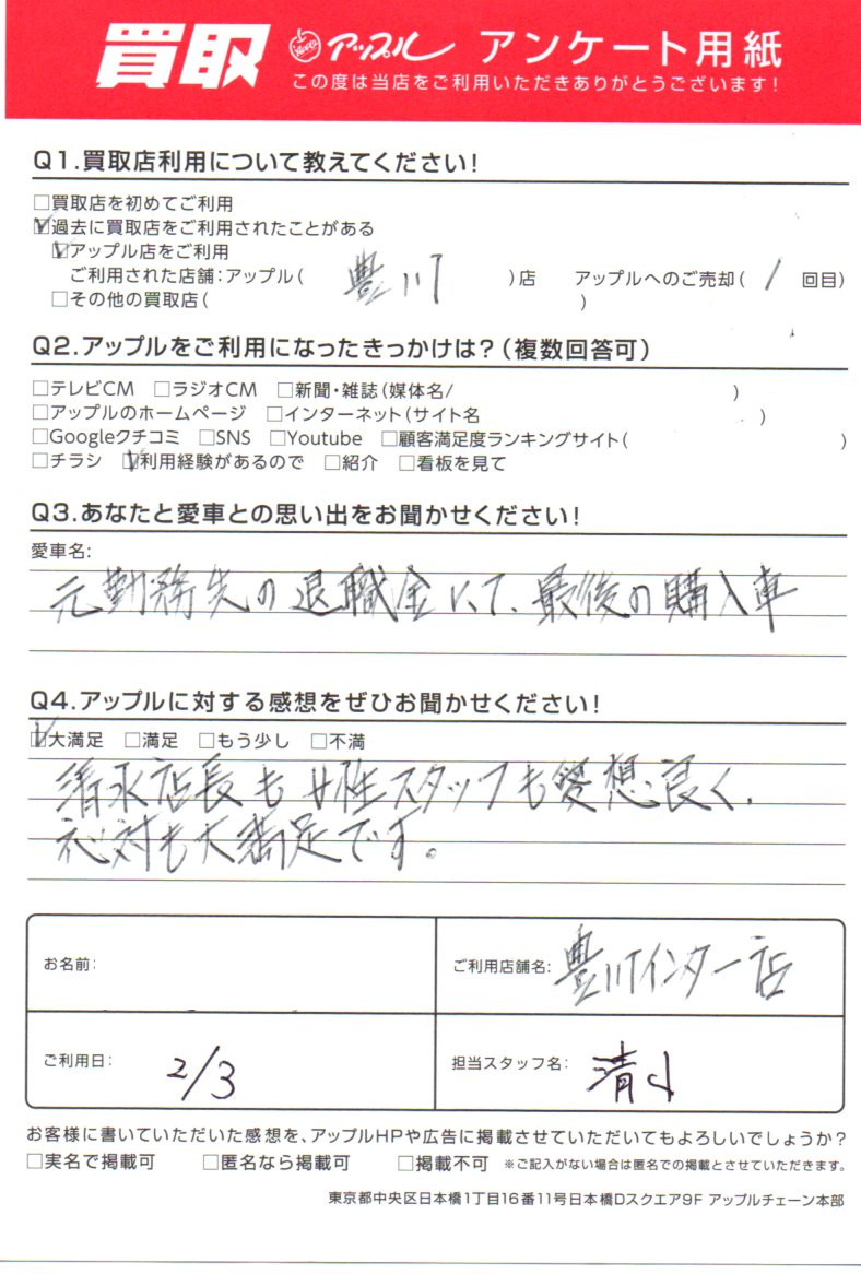 お車のご相談・ 査定だけでもOK! カンタン 入力 30秒 アップルがブランド買取始めました! お電話でも受付中! 受付時間10:00 ~ 19:00 0533-89-9777 お車のご相談・ 査定だけでもOK! カンタン 入力 30秒 アップルがブランド買取始めました! お電話でも受付中! 受付時間10:00 ~ 19:00 0533-89-9777 アップルがブランド買取始めました! お電話でも受付中! 受付時間10:00 ~ 19:00 0533-89-9777 店舗情報 在庫車 スタッフ紹介 ブログ お客様の声 キャンペーン お得 無料査定 click お客様の声 ご記入日: -/-/- 愛知県 匿名希望様 清水店長も女性スタッフも愛想よく、応対も大満足です。 前へ 次へ お客様の声一覧を見る