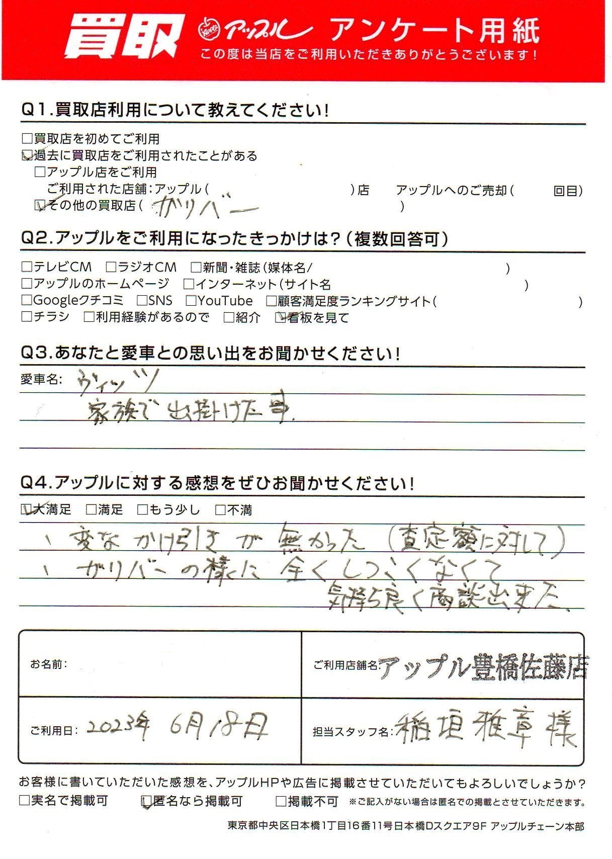 お車のご相談・ 査定だけでもOK! カンタン 入力 30秒 アップルがブランド買取始めました! お電話でも受付中! 受付時間10:00 ~ 19:00 0533-89-9777 お車のご相談・ 査定だけでもOK! カンタン 入力 30秒 アップルがブランド買取始めました! お電話でも受付中! 受付時間10:00 ~ 19:00 0533-89-9777 アップルがブランド買取始めました! お電話でも受付中! 受付時間10:00 ~ 19:00 0533-89-9777 店舗情報 在庫車 スタッフ紹介 ブログ お客様の声 キャンペーン お得 無料査定 click お客様の声 ご記入日: 2023/06/18 匿名希望様 車名:トヨタ 変なかけ引きが無かった(査定額に対して)全くしつこくなく気持ち良く商談出来た。 前へ 次へ お客様の声一覧を見る