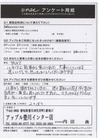 お車のご相談・ 査定だけでもOK! カンタン 入力 30秒 アップルがブランド買取始めました! お電話でも受付中! 受付時間10:00 ~ 19:00 0533-89-9777 お車のご相談・ 査定だけでもOK! カンタン 入力 30秒 アップルがブランド買取始めました! お電話でも受付中! 受付時間10:00 ~ 19:00 0533-89-9777 アップルがブランド買取始めました! お電話でも受付中! 受付時間10:00 ~ 19:00 0533-89-9777 店舗情報 在庫車 スタッフ紹介 ブログ お客様の声 キャンペーン お得 無料査定 click お客様の声 ご記入日: 2017/02/15 I様 愛車との思い出・・・ヴォクシー 10年以上新車から乗っていました。大事にしています。遠くに行った思い出がいっぱいあります。アップルに対する感想・・・以前から場所を知っていました。他の買取店も回りましたが当店が一番良くみていただきました。スタッフの方も対応は良く気に入っています。 前へ 次へ お客様の声一覧を見る