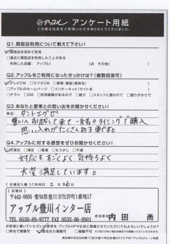 お車のご相談・ 査定だけでもOK! カンタン 入力 30秒 アップルがブランド買取始めました! お電話でも受付中! 受付時間10:00 ~ 19:00 0533-89-9777 お車のご相談・ 査定だけでもOK! カンタン 入力 30秒 アップルがブランド買取始めました! お電話でも受付中! 受付時間10:00 ~ 19:00 0533-89-9777 アップルがブランド買取始めました! お電話でも受付中! 受付時間10:00 ~ 19:00 0533-89-9777 店舗情報 在庫車 スタッフ紹介 ブログ お客様の声 キャンペーン お得 無料査定 click お客様の声 ご記入日: 2017/02/26 T様 愛車との思い出・・・タントエグゼ 豊川へ引っ越して来て一緒のタイミングで購入思い入れがたくさんある車です。アップルに対する感想・・・対応もすごくよく気持ちよく大変満足しています。 前へ 次へ お客様の声一覧を見る