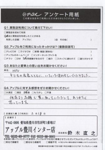 お車のご相談・ 査定だけでもOK! カンタン 入力 30秒 アップルがブランド買取始めました! お電話でも受付中! 受付時間10:00 ~ 19:00 0533-89-9777 お車のご相談・ 査定だけでもOK! カンタン 入力 30秒 アップルがブランド買取始めました! お電話でも受付中! 受付時間10:00 ~ 19:00 0533-89-9777 アップルがブランド買取始めました! お電話でも受付中! 受付時間10:00 ~ 19:00 0533-89-9777 店舗情報 在庫車 スタッフ紹介 ブログ お客様の声 キャンペーン お得 無料査定 click お客様の声 ご記入日: 2017/02/18 K様 愛車との思い出・・・MPV子どもの成長とともに、いろいろ使わせていただきました。アップルに対する感想・・・他店より高額で買い取っていただいて、ありがたく思っています。 前へ 次へ お客様の声一覧を見る