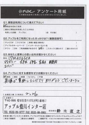 お車のご相談・ 査定だけでもOK! カンタン 入力 30秒 アップルがブランド買取始めました! お電話でも受付中! 受付時間10:00 ~ 19:00 0533-89-9777 お車のご相談・ 査定だけでもOK! カンタン 入力 30秒 アップルがブランド買取始めました! お電話でも受付中! 受付時間10:00 ~ 19:00 0533-89-9777 アップルがブランド買取始めました! お電話でも受付中! 受付時間10:00 ~ 19:00 0533-89-9777 店舗情報 在庫車 スタッフ紹介 ブログ お客様の声 キャンペーン お得 無料査定 click お客様の声 ご記入日: 2017/02/26 I様 愛車との思い出・・・マジェスタディズニー 大阪 伊豆 京都 静岡 ユニバアップルに対する感想・・・高値で買取してくださりありがとうございました。 前へ 次へ お客様の声一覧を見る