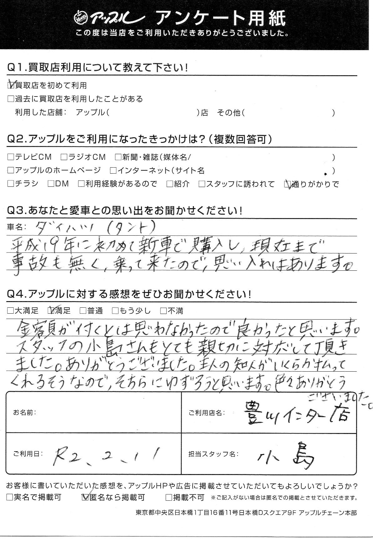 お車のご相談・ 査定だけでもOK! カンタン 入力 30秒 アップルがブランド買取始めました! お電話でも受付中! 受付時間10:00 ~ 19:00 0533-89-9777 お車のご相談・ 査定だけでもOK! カンタン 入力 30秒 アップルがブランド買取始めました! お電話でも受付中! 受付時間10:00 ~ 19:00 0533-89-9777 アップルがブランド買取始めました! お電話でも受付中! 受付時間10:00 ~ 19:00 0533-89-9777 店舗情報 在庫車 スタッフ紹介 ブログ お客様の声 キャンペーン お得 無料査定 click お客様の声 ご記入日: 2020/02/11 匿名希望様 車名:ダイハツ タント 金額が付くとは思わなかったので良かったと思います。スタッフの小島さんもとても親切に対応して頂きました。ありがとうございました。主人の知人がいくらか払ってくれるそうなので、そちらにゆずろうと思います。色々ありがとうございました。 前へ 次へ お客様の声一覧を見る