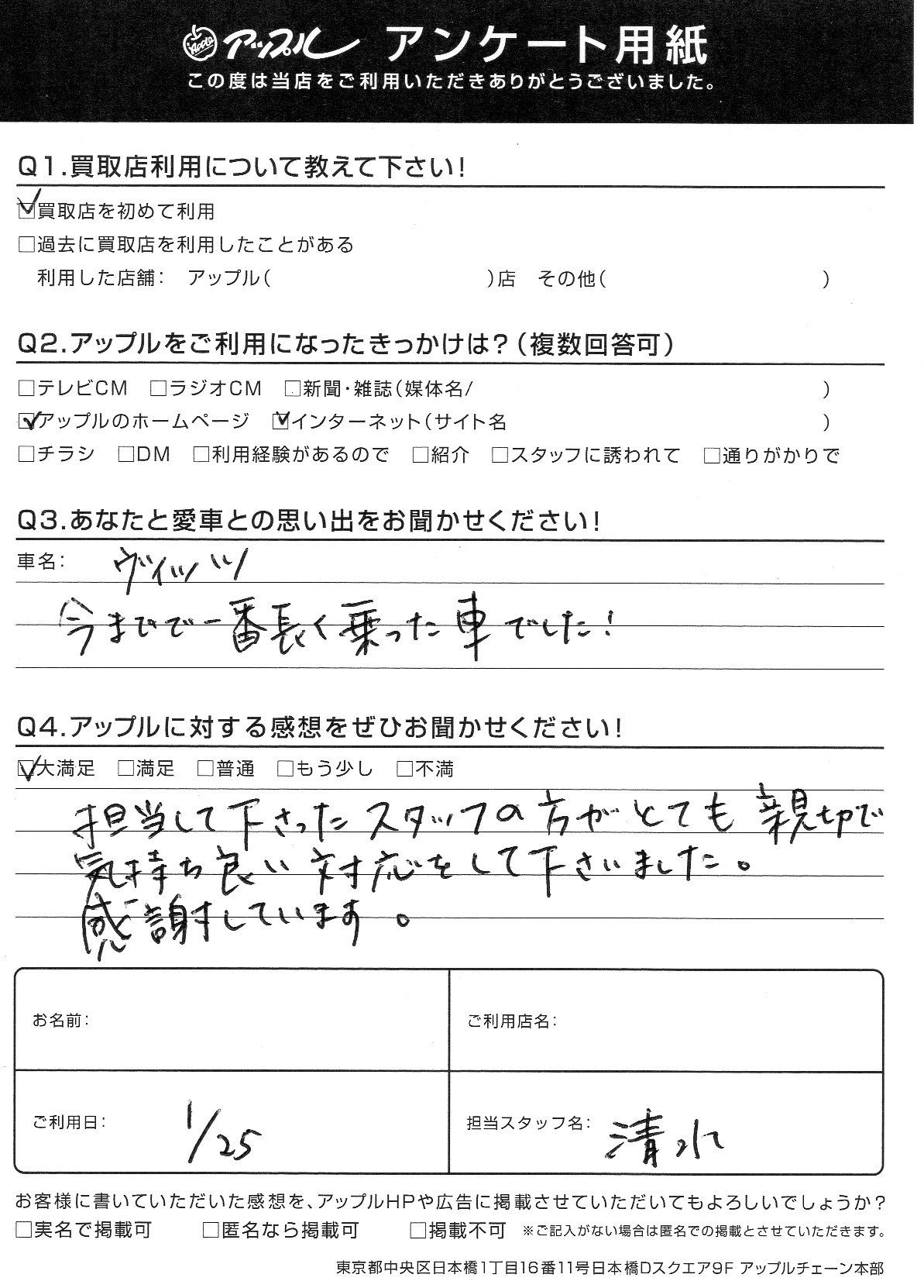 お車のご相談・ 査定だけでもOK! カンタン 入力 30秒 アップルがブランド買取始めました! お電話でも受付中! 受付時間10:00 ~ 19:00 0533-89-9777 お車のご相談・ 査定だけでもOK! カンタン 入力 30秒 アップルがブランド買取始めました! お電話でも受付中! 受付時間10:00 ~ 19:00 0533-89-9777 アップルがブランド買取始めました! お電話でも受付中! 受付時間10:00 ~ 19:00 0533-89-9777 店舗情報 在庫車 スタッフ紹介 ブログ お客様の声 キャンペーン お得 無料査定 click お客様の声 ご記入日: 2020/01/25 匿名希望様 車名:トヨタ ヴィッツ 担当して下さったスタッフの方がとても親切で気持ちの良い対応をして下さいました。感謝しています。 前へ 次へ お客様の声一覧を見る