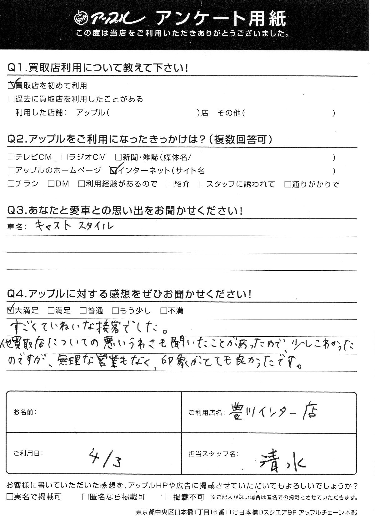 お車のご相談・ 査定だけでもOK! カンタン 入力 30秒 アップルがブランド買取始めました! お電話でも受付中! 受付時間10:00 ~ 19:00 0533-89-9777 お車のご相談・ 査定だけでもOK! カンタン 入力 30秒 アップルがブランド買取始めました! お電話でも受付中! 受付時間10:00 ~ 19:00 0533-89-9777 アップルがブランド買取始めました! お電話でも受付中! 受付時間10:00 ~ 19:00 0533-89-9777 店舗情報 在庫車 スタッフ紹介 ブログ お客様の声 キャンペーン お得 無料査定 click お客様の声 ご記入日: 2020/04/03 愛知県 匿名希望様 車名:ダイハツ キャスト すごくていねいな接客でした。他買取店についての悪いうわさも聞いたことがあったので、少しこわかったのですが、無理な営業もなく、印象がとても良かったです。 前へ 次へ お客様の声一覧を見る