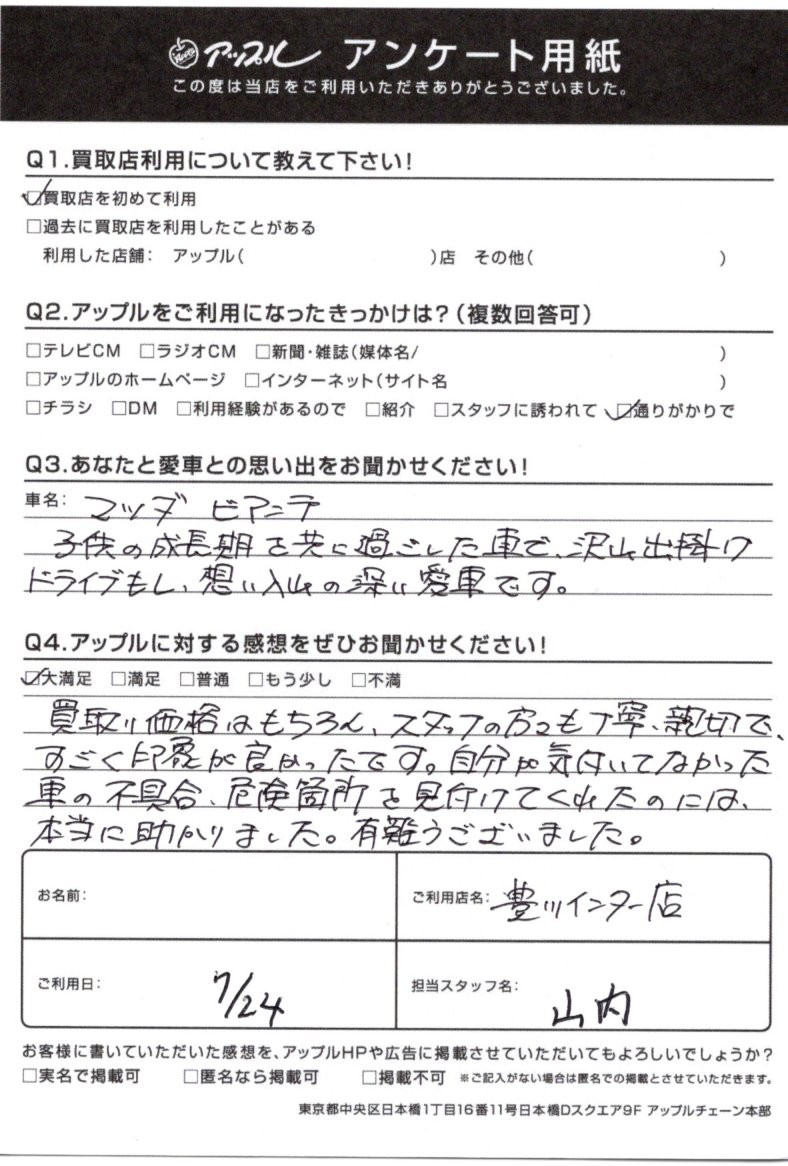 お車のご相談・ 査定だけでもOK! カンタン 入力 30秒 アップルがブランド買取始めました! お電話でも受付中! 受付時間10:00 ~ 19:00 0533-89-9777 お車のご相談・ 査定だけでもOK! カンタン 入力 30秒 アップルがブランド買取始めました! お電話でも受付中! 受付時間10:00 ~ 19:00 0533-89-9777 アップルがブランド買取始めました! お電話でも受付中! 受付時間10:00 ~ 19:00 0533-89-9777 店舗情報 在庫車 スタッフ紹介 ブログ お客様の声 キャンペーン お得 無料査定 click お客様の声 ご記入日: 2020/07/24 愛知県 匿名希望様 車名:マツダ ビアンテ 買取り価格はもちろん、スタッフの方々も丁寧、親切で、すごく印象が良かったです。自分が気付いていなかった車の不具合、危険箇所を見つけてくれたのには、本当に助かりました。有難うございました。 前へ 次へ お客様の声一覧を見る