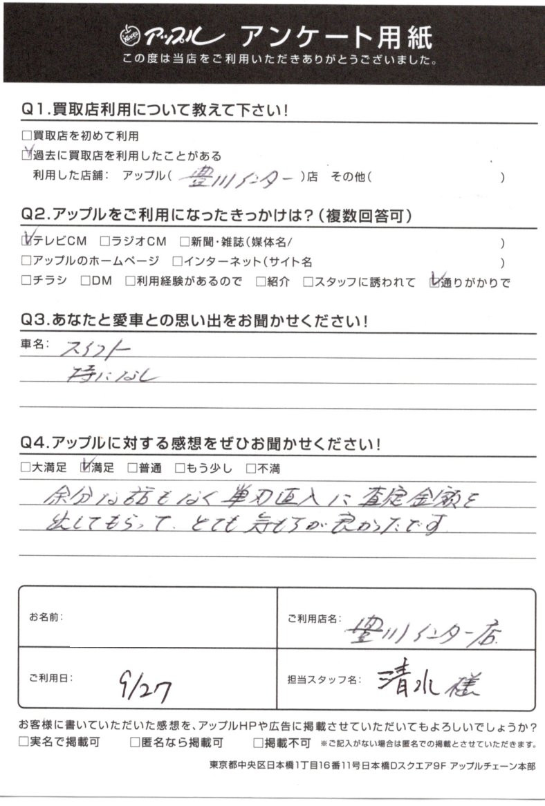 お車のご相談・ 査定だけでもOK! カンタン 入力 30秒 アップルがブランド買取始めました! お電話でも受付中! 受付時間10:00 ~ 19:00 0533-89-9777 お車のご相談・ 査定だけでもOK! カンタン 入力 30秒 アップルがブランド買取始めました! お電話でも受付中! 受付時間10:00 ~ 19:00 0533-89-9777 アップルがブランド買取始めました! お電話でも受付中! 受付時間10:00 ~ 19:00 0533-89-9777 店舗情報 在庫車 スタッフ紹介 ブログ お客様の声 キャンペーン お得 無料査定 click お客様の声 ご記入日: 2020/09/27 愛知県 匿名希望様 車名:スズキ スイフト 余分な話もなく単刀直入に査定金額を出してもらって、とても気持ちが良かったです。 前へ 次へ お客様の声一覧を見る