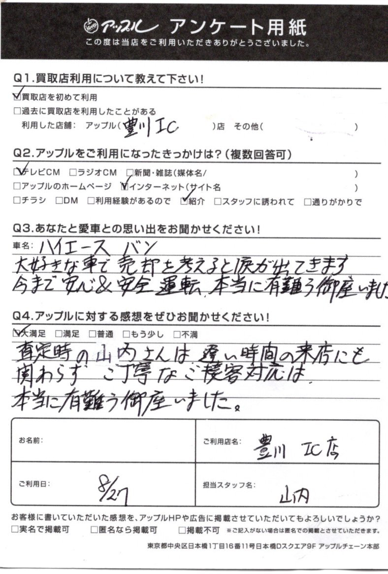 お車のご相談・ 査定だけでもOK! カンタン 入力 30秒 アップルがブランド買取始めました! お電話でも受付中! 受付時間10:00 ~ 19:00 0533-89-9777 お車のご相談・ 査定だけでもOK! カンタン 入力 30秒 アップルがブランド買取始めました! お電話でも受付中! 受付時間10:00 ~ 19:00 0533-89-9777 アップルがブランド買取始めました! お電話でも受付中! 受付時間10:00 ~ 19:00 0533-89-9777 店舗情報 在庫車 スタッフ紹介 ブログ お客様の声 キャンペーン お得 無料査定 click お客様の声 ご記入日: 2020/08/27 愛知県 匿名希望様 車名:トヨタ ハイエースバン 査定時の山内さんは遅い時間の来店にも関わらず、ご丁寧なご接客対応は、本当に有難う御座いました。 前へ 次へ お客様の声一覧を見る