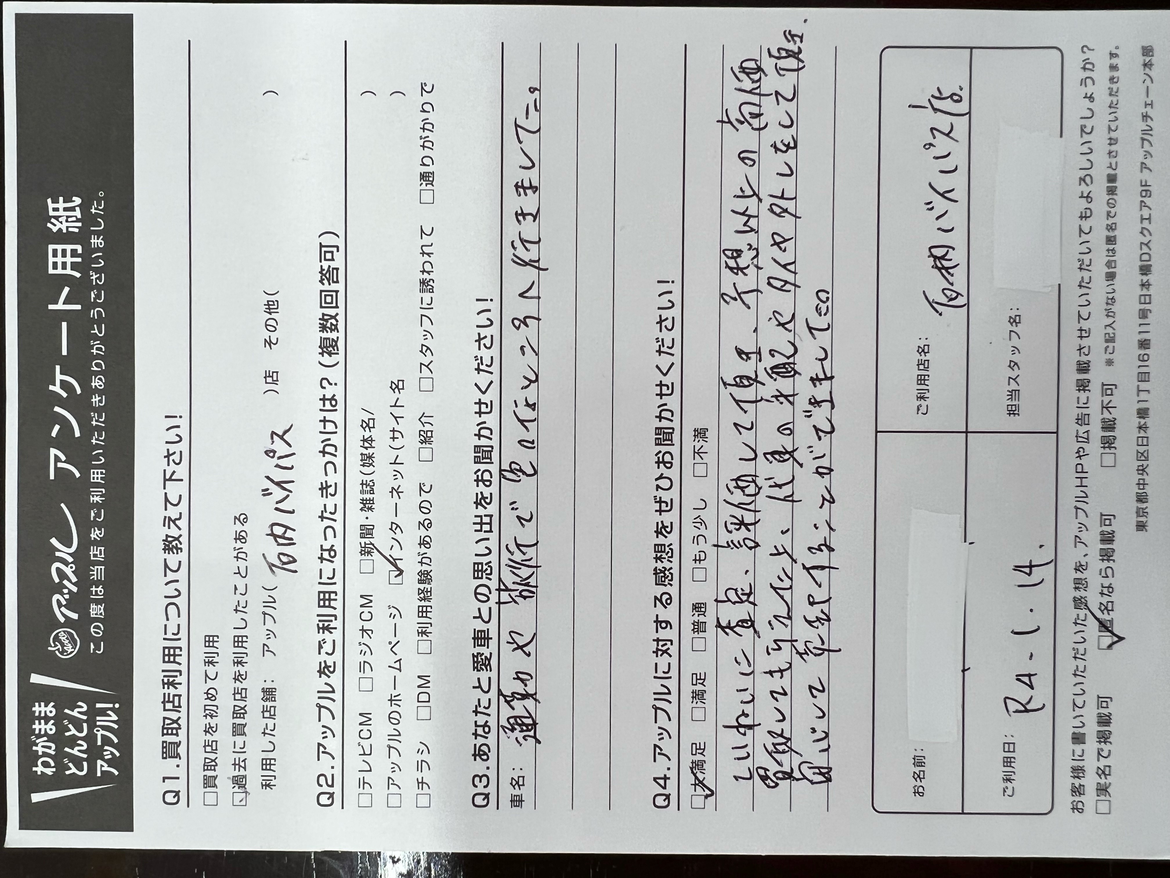 ていねいに査定・評価をして頂き、予想以上の高価買取をしてもらえた上、代車の手配やタイヤ外しをして頂き安心して売却することができました。