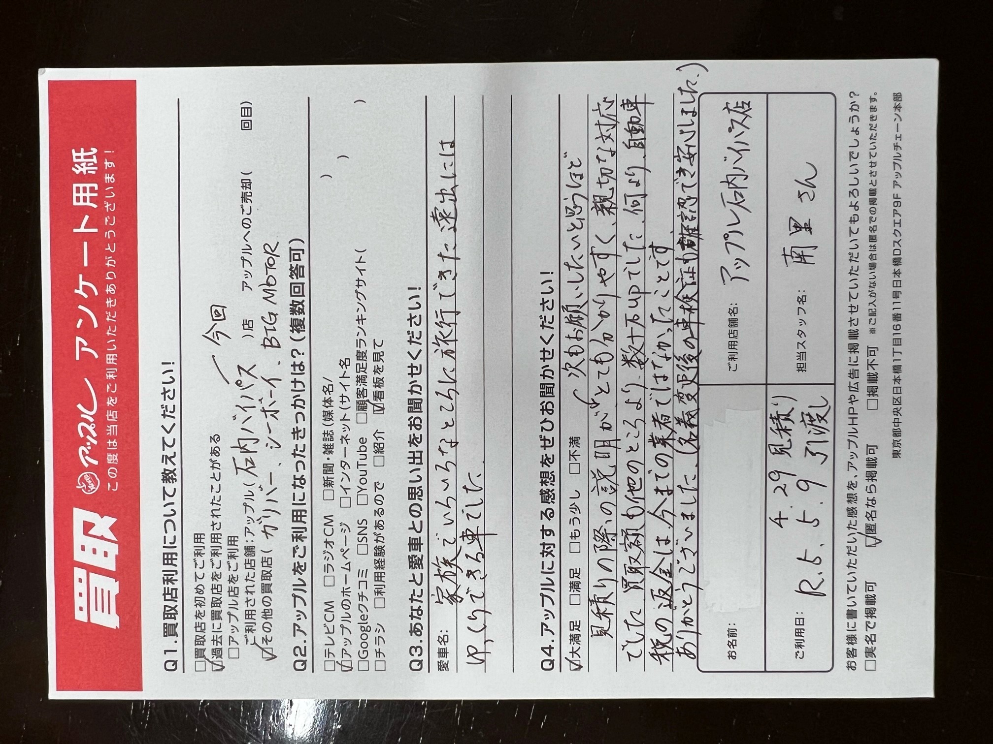 見積もりの際の説明が次もお願いしたいと思うほどとても分かりやすく親切な対応でした。買い取り額も他のところより数十万upでした。何より自動車税の返金は今までの業者では無かったことです。ありがとうございました。名義変更後の車検証も確認でき安心しました。