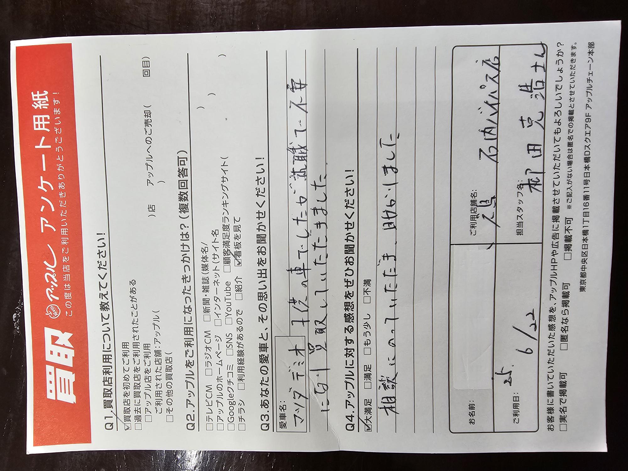 お車のご相談・ 査定だけでもOK! カンタン 入力 30秒 アップルがブランド買取始めました! お電話でも受付中! 受付時間9:00~18:00 トラブル防止の為電話査定はお断りしております。 0120-685-900 お車のご相談・ 査定だけでもOK! カンタン 入力 30秒 アップルがブランド買取始めました! お電話でも受付中! 受付時間9:00~18:00 トラブル防止の為電話査定はお断りしております。 0120-685-900 アップルがブランド買取始めました! お電話でも受付中! 受付時間9:00~18:00 トラブル防止の為電話査定はお断りしております。 0120-685-900 店舗情報 在庫車 スタッフ紹介 ブログ お客様の声 キャンペーン お得 無料査定 click お客様の声 ご記入日: 2025/06/22 広島県広島市 K様 車名:マツダ デミオ Q:あなたの愛車と、その思い出を聞かせてください。子供の車でしたが就職で不安になり買取していただきました。大満足相談に乗っていただき助かりました。 前へ 次へ お客様の声一覧を見る