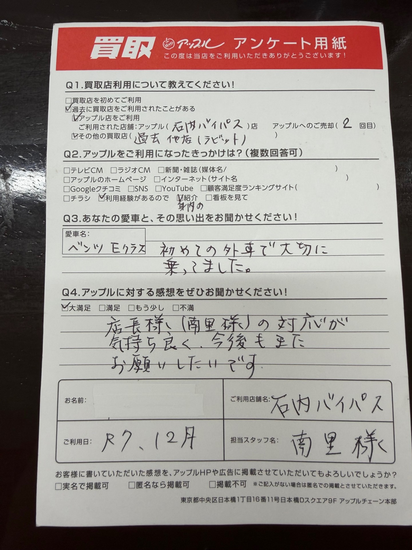 広島県広島市 I様 車名:メルセデス・ベンツ Eクラス(93年9月~)