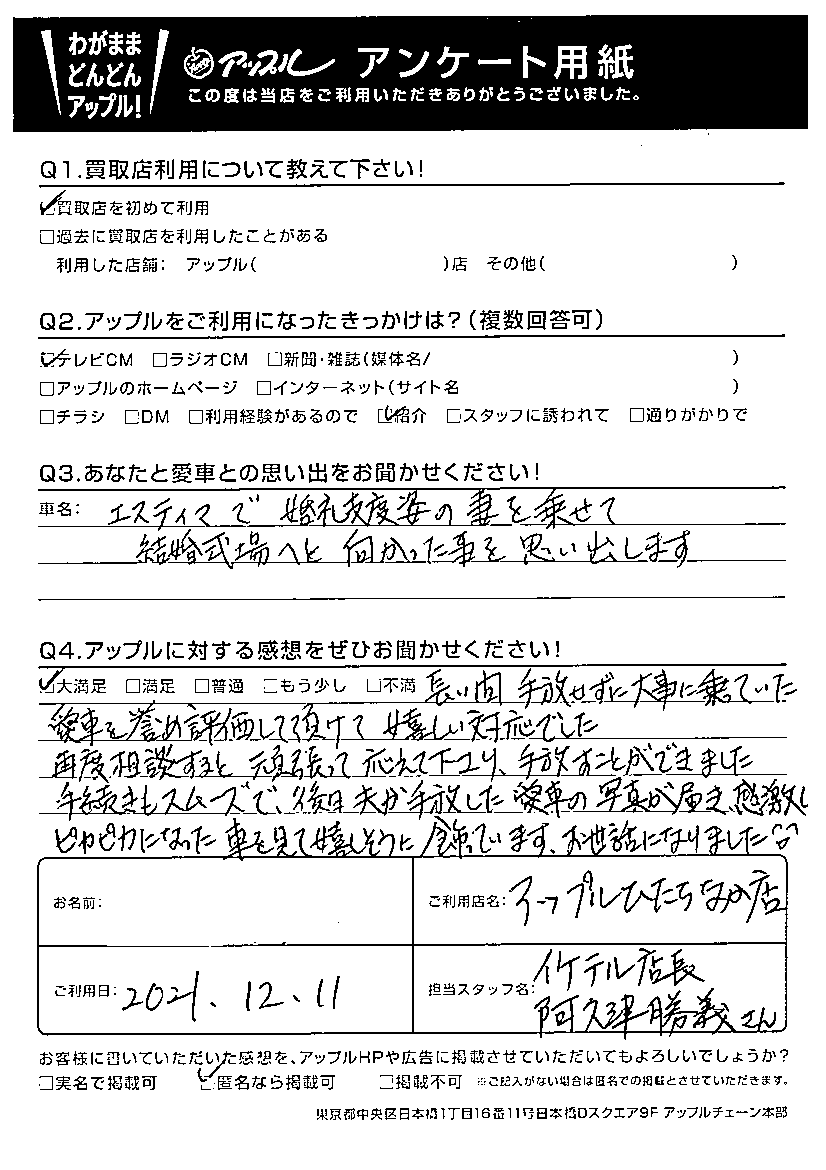 ☆大満足☆長い間、手放せずに大事に乗っていた愛車を誉め評価して頂けてうれしい対応でした。再度相談すると頑張って応えて下さり、手放すことができました。手続きもスムーズで、後日夫が手放した愛車の写真が届き感激しピカピカになった車を見て嬉しそうに飾っています。お世話になりました(^^)