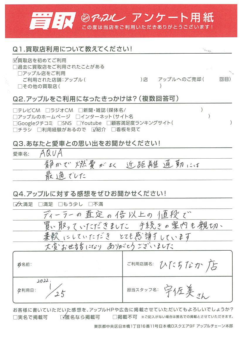 ☆大満足☆ディーラーの査定の倍以上値段で買い取っていただきました 手続きの案内も親切、柔軟にしていただき とても感謝しています 大変お世話になりありがとうございました