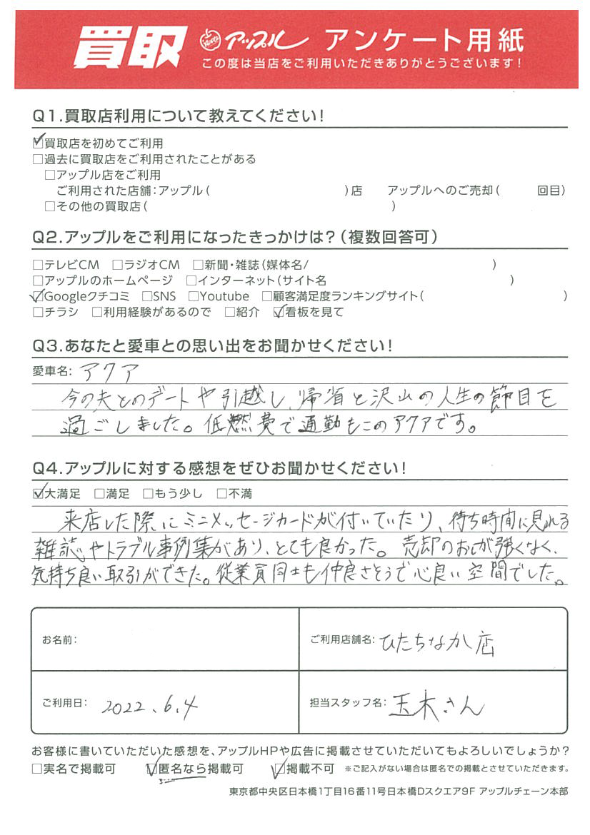 ☆大満足☆来店した際にミニメッセージカードが付いていたり、待ち時間に見れる雑誌やトラブル事例集があり、とても良かった。売却のおしが強くなく、気持ち良い取引ができた。従業員同士も仲良さそうで心良い空間でした。