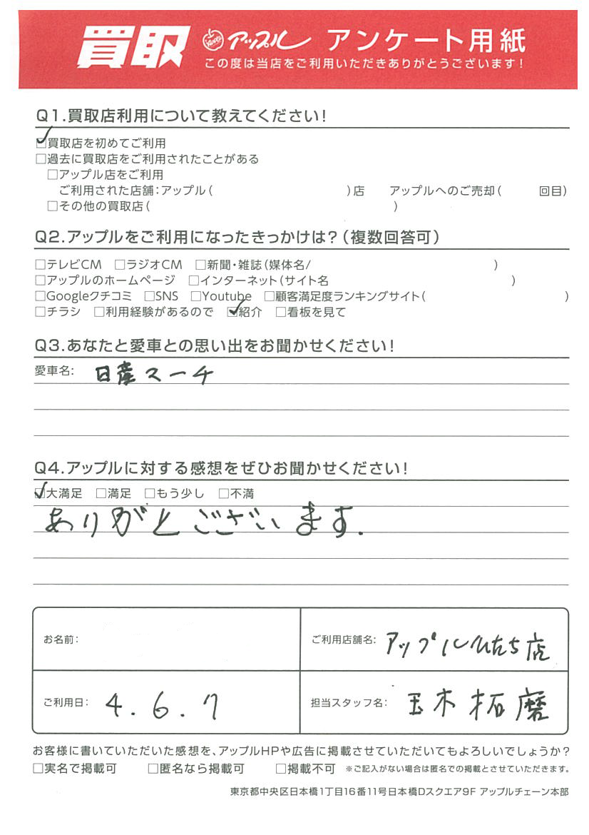 この度は、マーチを当店へお任せ下さりありがとうございます。