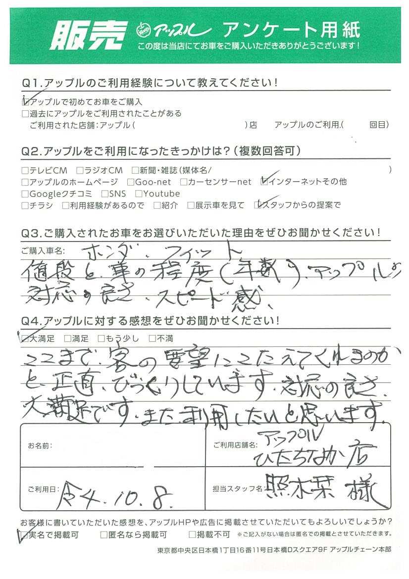 I様 車名:ホンダ フィット(H25年9月以降のハイブリッド含む)