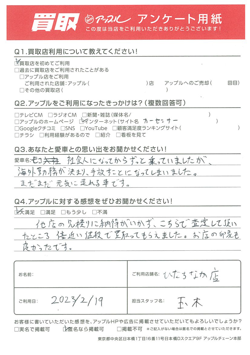 この度は当店へモコをお任せ下さり、ありがとうございます。
