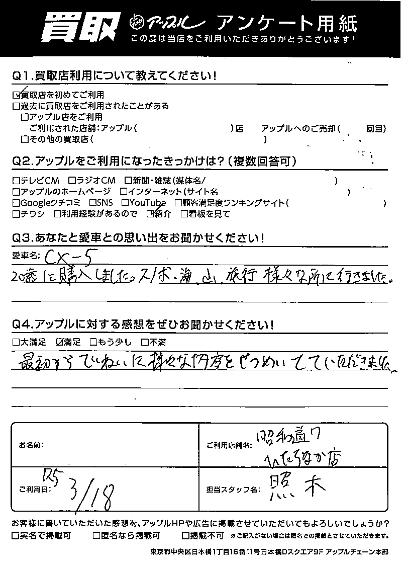 この度は、ご紹介でご来店いただきCX-5を当店へお任せ下さいまして、ありがとうございました。