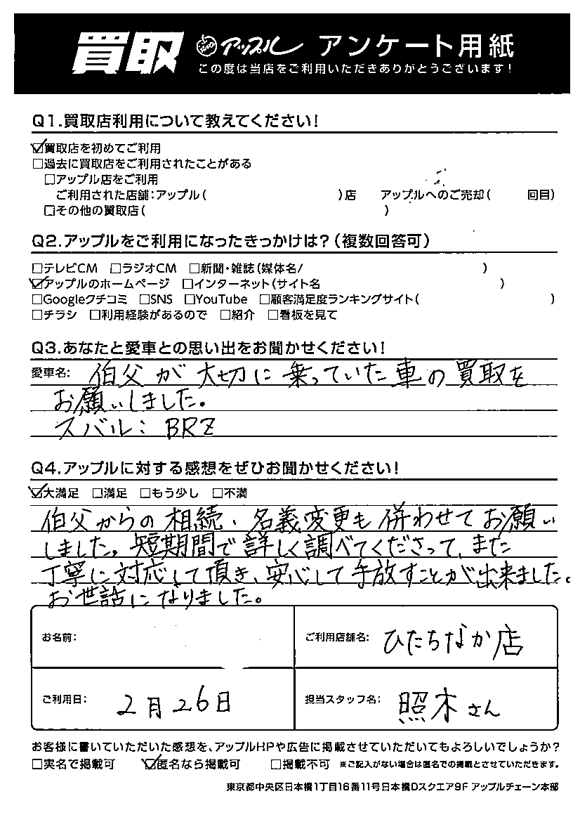 この度は、BRZを当店へお任せ下さり誠にありがとうございます。