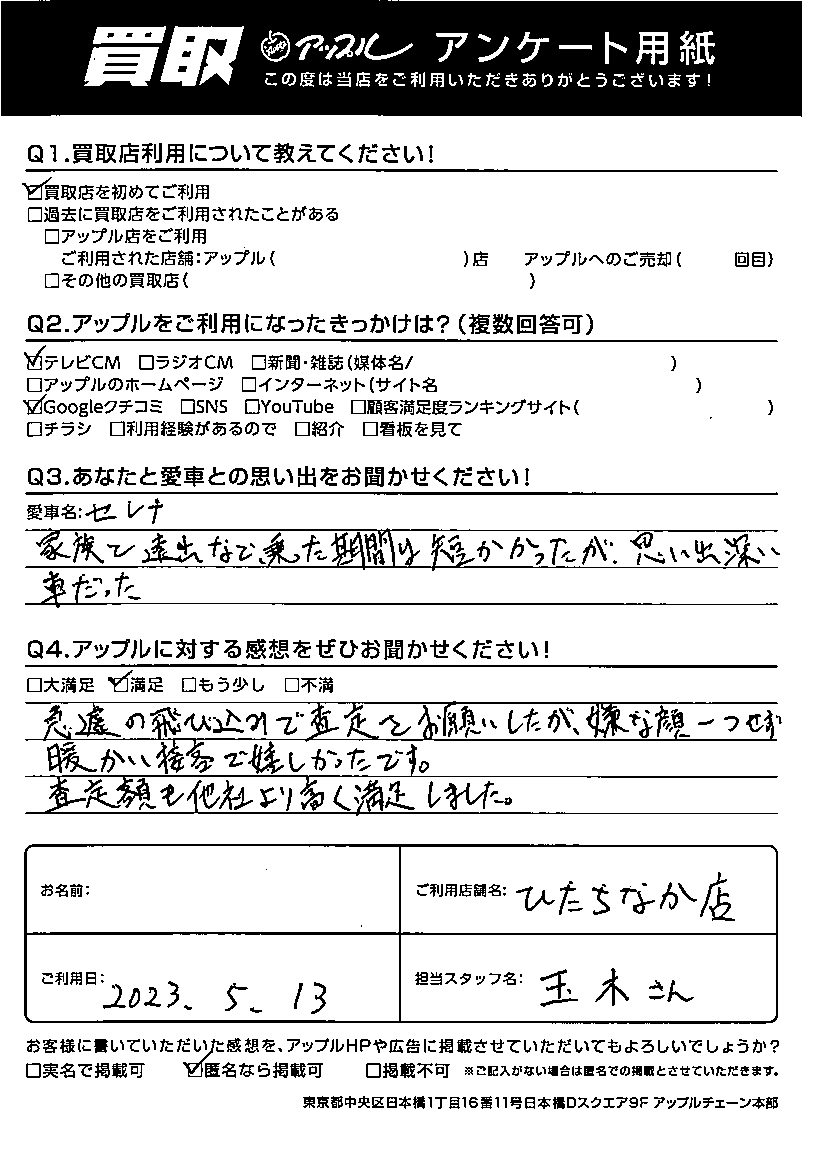 ☆満足☆急遽の飛び込みで査定をお願いしたが、嫌な顔一つせず暖かい接客で嬉しかったです。査定額も他社より高く満足しました。