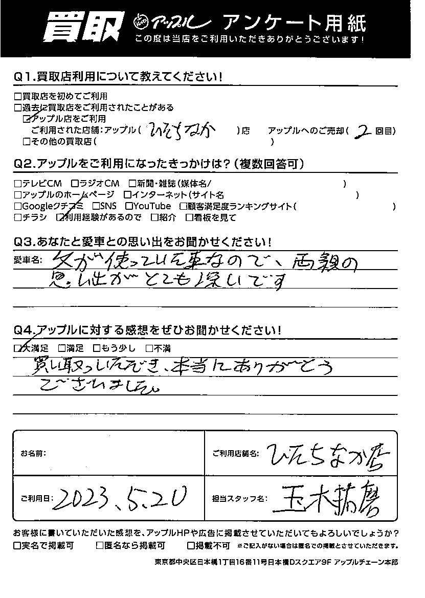 こちらこそ、ご両親様との思い出のお車をお任せ下さり、大変嬉しく思います!
