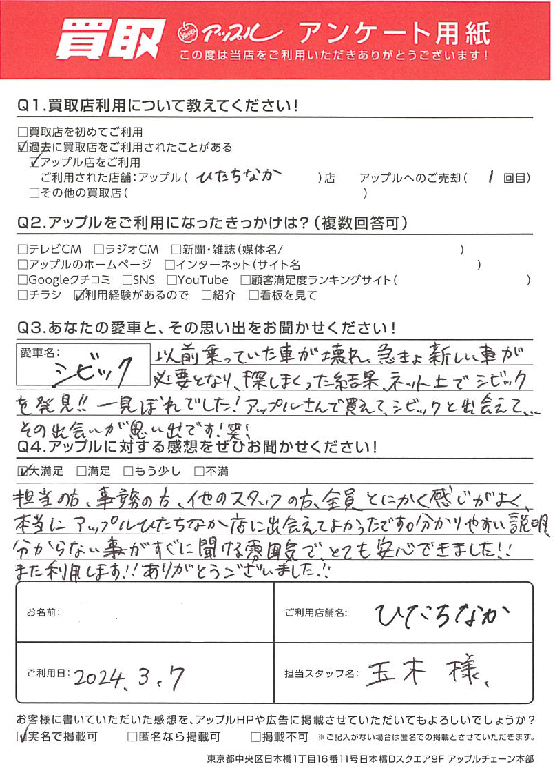 担当の方、事務の方、他のスタッフの方、全員とにかく感じが良く、本当にアップルひたちなか店に出会えてよかったです。