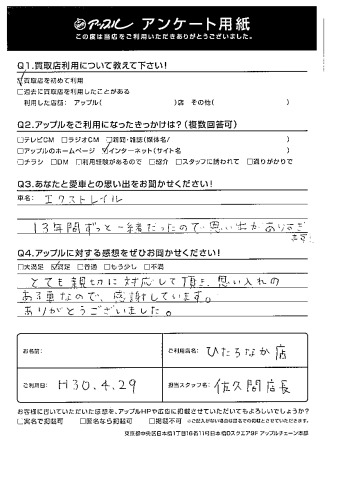 ☆満足☆ とても親切に対応して頂き、思い入れのある車なので、感謝しています。ありがとうございました。