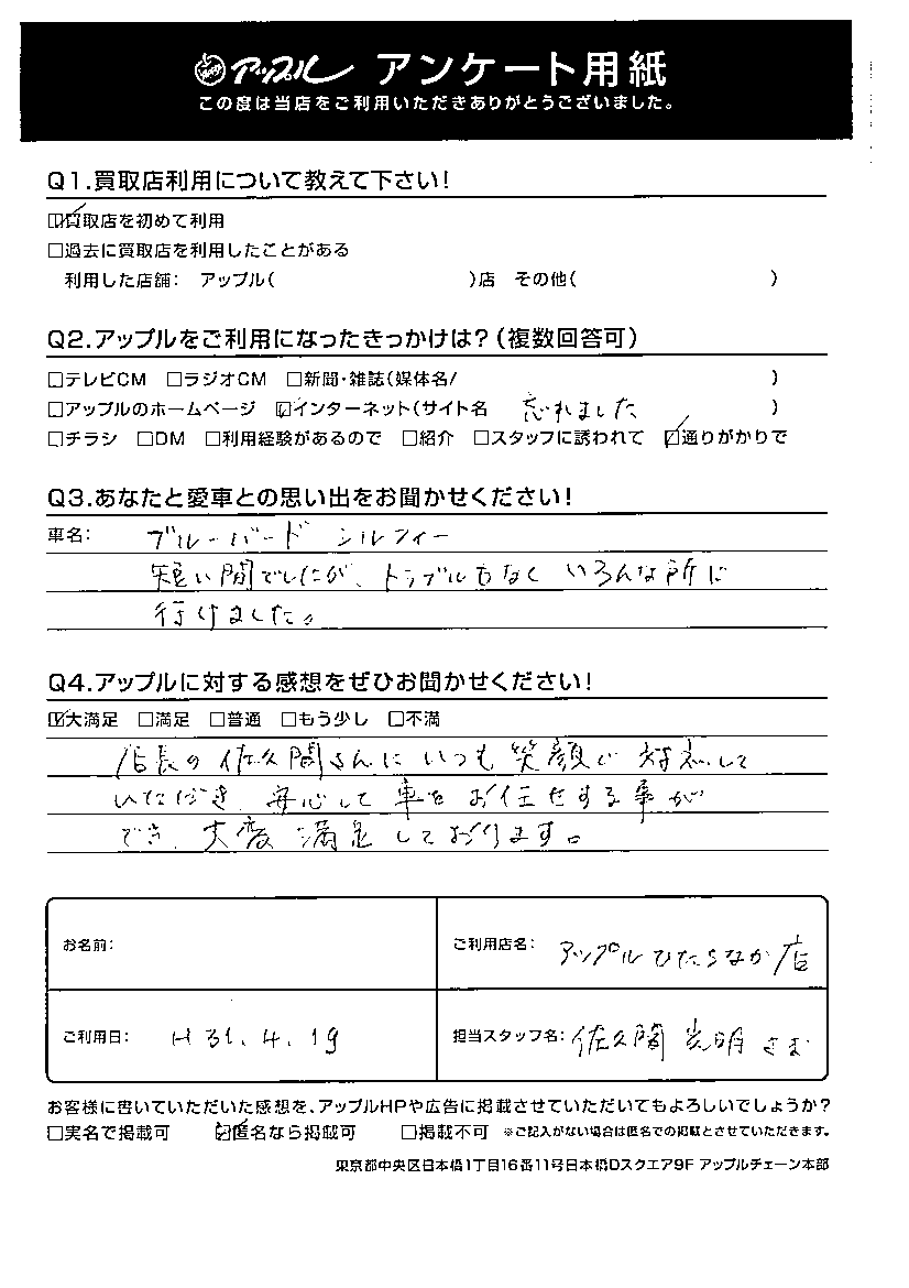 この度は、ブルーバード シルフィをお任せ下さり、ありがとうございました。