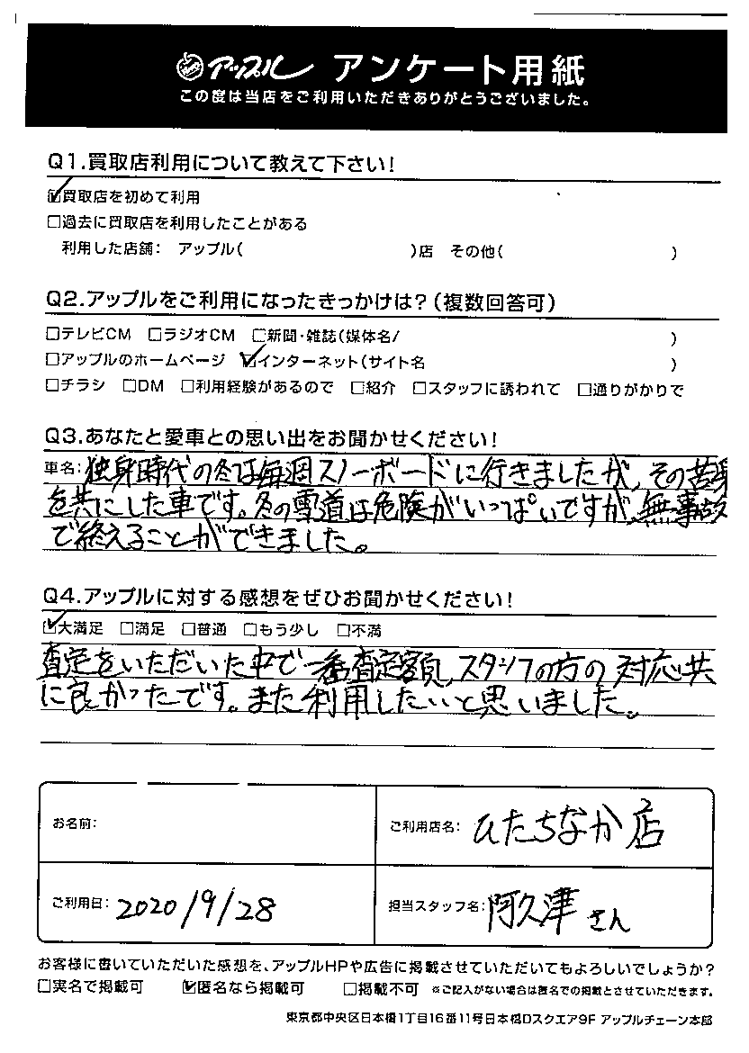☆大満足☆査定をいただいた中で一番査定額、スタッフの方の対応共に良かったです。また利用したいと思いました。