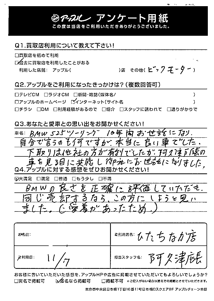 ☆大満足☆BMWの良さを正確に評価していただき、同じ売却をするなら、この方にしようと思いました。(愛着があったため)