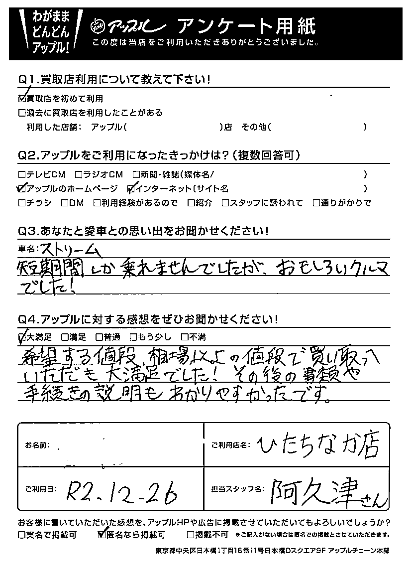 この度は、ストリームを当店へお任せ下さりありがとうございました。