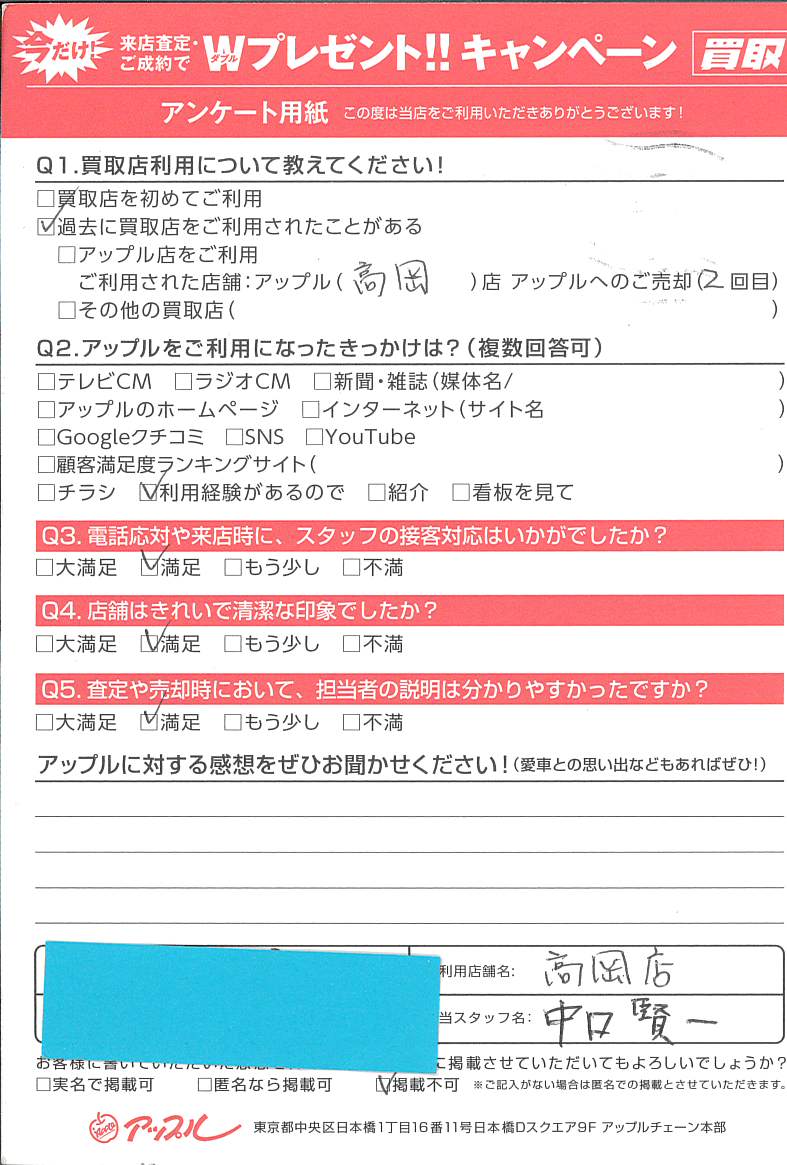 A:アップル高岡店2度目のご利用