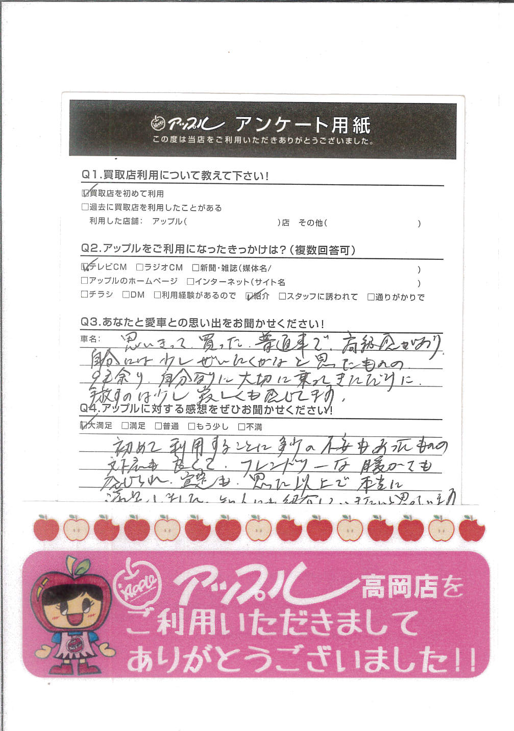 この度は数ある買取店がある中、アップル高岡店ご利用ありがとうございました。大変きれいに丁寧に使用されていたお車で、思わず奮発してしまいました。仲の良いご夫婦でご来店いただき、最初は不安もあったでしょうがスムーズな商談させていただきました。