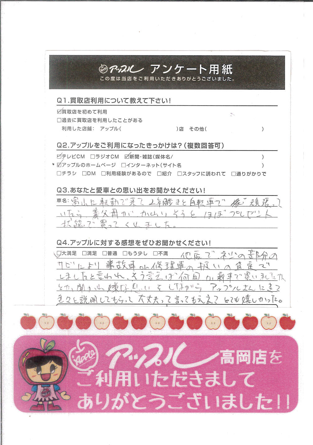 他店でネジの部分のサビにより事故車or修理車の扱いの査定で しましたと言われ、そう言えば何回か新車で買いましたかとか、聞かれ嫌な思いをしながら アップルさんに来て色々と説明してもらって大丈夫って言ってもらえてとても嬉しかった。(原文そのまま)