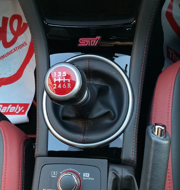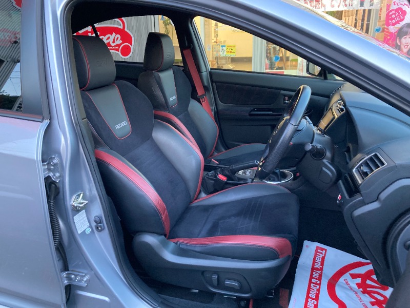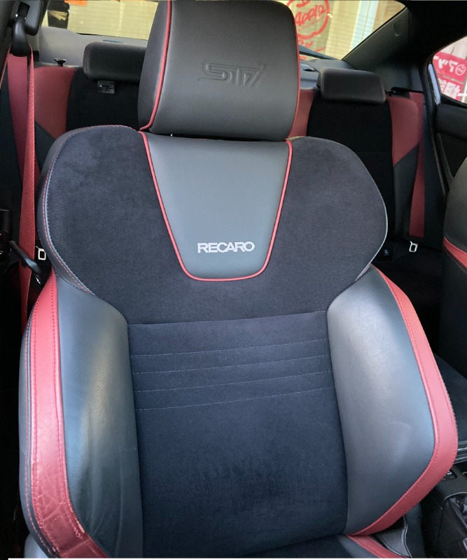 赤いアクセントが印象的なレカロの専用コンビシート。シートベルトも「赤」です。ヘッドレストには「STI」ロゴがエンボス加工されています。前席はシートヒーター&パワーシートとなっています。