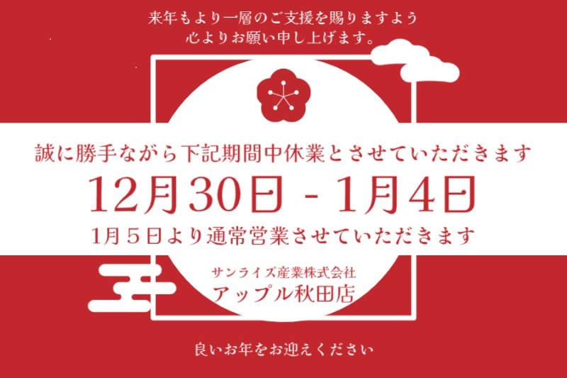 アップル秋田店は2025年12月30日(火)から2026年1月4日(日)までを年末年始休業とさせていただきます。