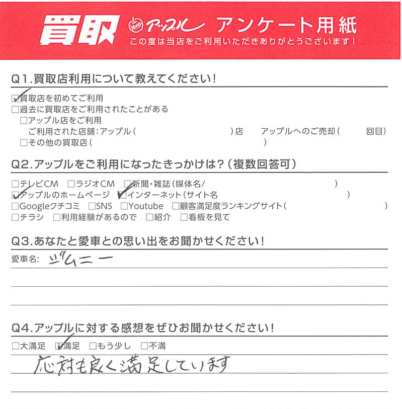 お車のご相談・ 査定だけでもOK! カンタン 入力 30秒 アップルがブランド買取始めました! お電話でも受付中! 受付時間10:00 ~ 19:00 最終受付 : 18時00分 0120-270-003 お車のご相談・ 査定だけでもOK! カンタン 入力 30秒 アップルがブランド買取始めました! お電話でも受付中! 受付時間10:00 ~ 19:00 最終受付 : 18時00分 0120-270-003 アップルがブランド買取始めました! お電話でも受付中! 受付時間10:00 ~ 19:00 最終受付 : 18時00分 0120-270-003 店舗情報 在庫車 スタッフ紹介 ブログ お客様の声 キャンペーン 無料査定 click お客様の声 ご記入日: 2022/02/12 秋田県 匿名様 車名:スズキ ジムニー Q.アップルに対する感想をぜひお聞かせください! 満足度:★★★★A.応対も良く満足しています。 前へ 次へ お客様の声一覧を見る
