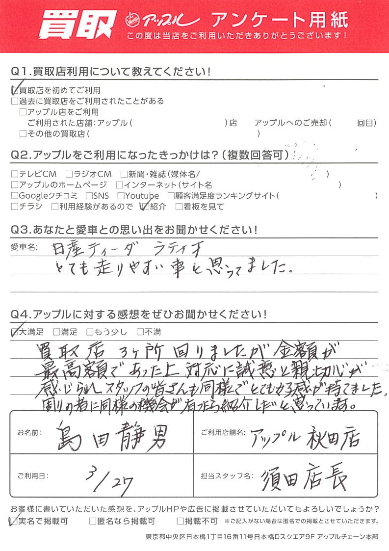 秋田県 島田 静男様 車名:日産 ティーダラティオ ラティオ(ティーダ)
