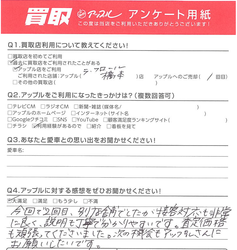 査定価格も頑張ってくださいました。次の機会もアップルさんにお願いしたいです。