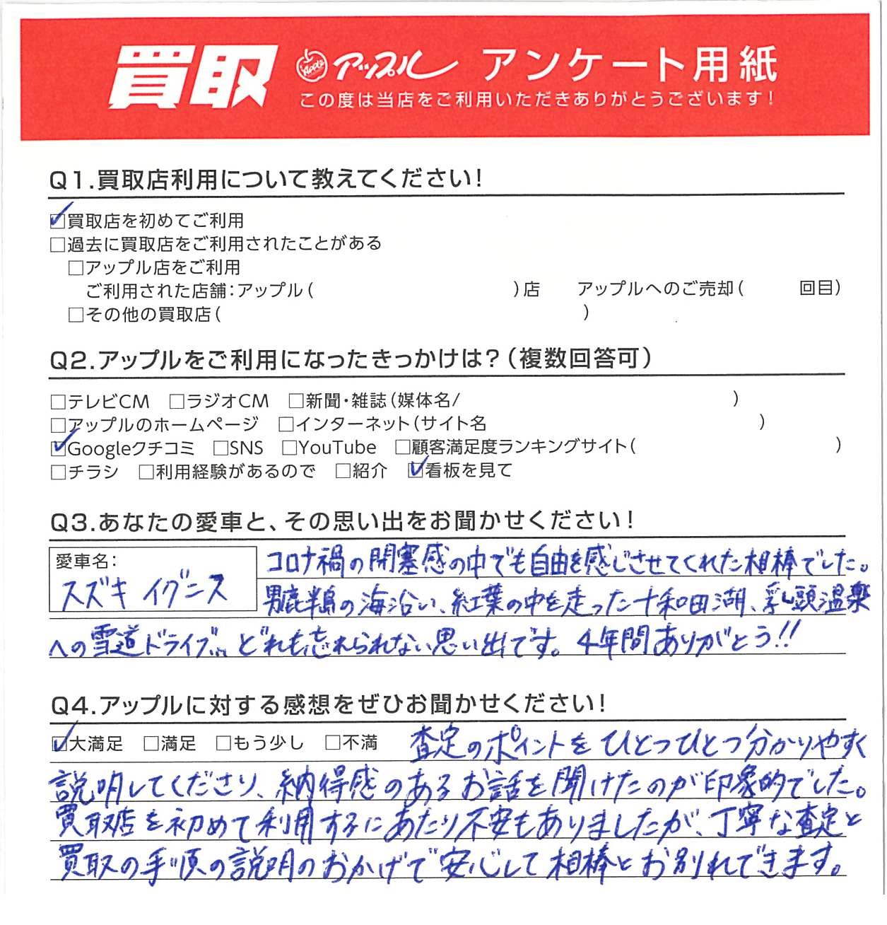 買取店を初めて利用するにあたり不安もありましたが、丁寧な査定と買取の手順の説明のおかげで安心して相棒とお別れできます。