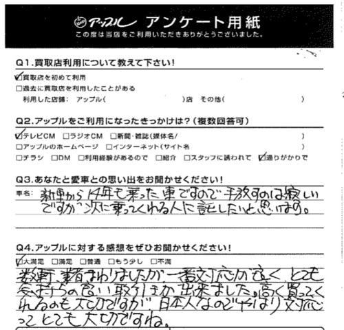 新車から14年も乗った車ですので、手放すのは寂しいですが、次に乗ってくれる人に託したいと思います。
