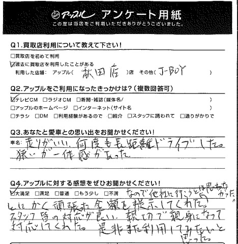 とにかく頑張った金額を提示してくれた。なので他社に行こうとは思わなかった。スタッフ皆の対応が良い。親切で親身になって対応してくれた。是非また利用してみたいと思った。