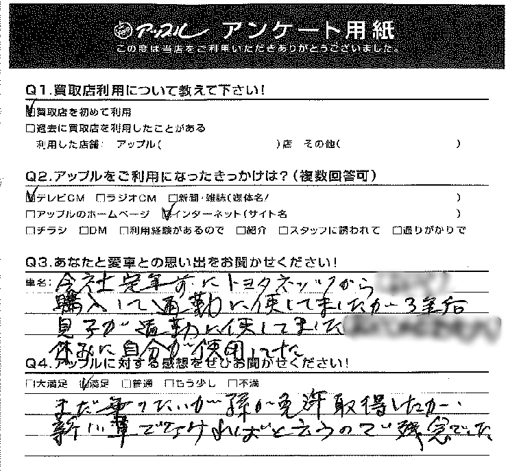 ・まだ乗りたいが孫が免許を取得したが、新しい車でなければというので残念でした。