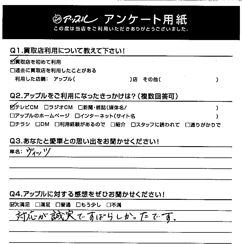 お車のご相談・ 査定だけでもOK! カンタン 入力 30秒 アップルがブランド買取始めました! お電話でも受付中! 受付時間10:00 ~ 19:00 最終受付 : 18時00分 0120-270-003 お車のご相談・ 査定だけでもOK! カンタン 入力 30秒 アップルがブランド買取始めました! お電話でも受付中! 受付時間10:00 ~ 19:00 最終受付 : 18時00分 0120-270-003 アップルがブランド買取始めました! お電話でも受付中! 受付時間10:00 ~ 19:00 最終受付 : 18時00分 0120-270-003 店舗情報 在庫車 スタッフ紹介 ブログ お客様の声 キャンペーン 無料査定 click お客様の声 ご記入日: 2020/10/18 秋田県 匿名様 車名:トヨタ ヴィッツ ☆アップルに対する感想をぜひお聞かせください!! 満足度:★★★★★ 対応が誠実ですばらしかったです。 前へ 次へ お客様の声一覧を見る
