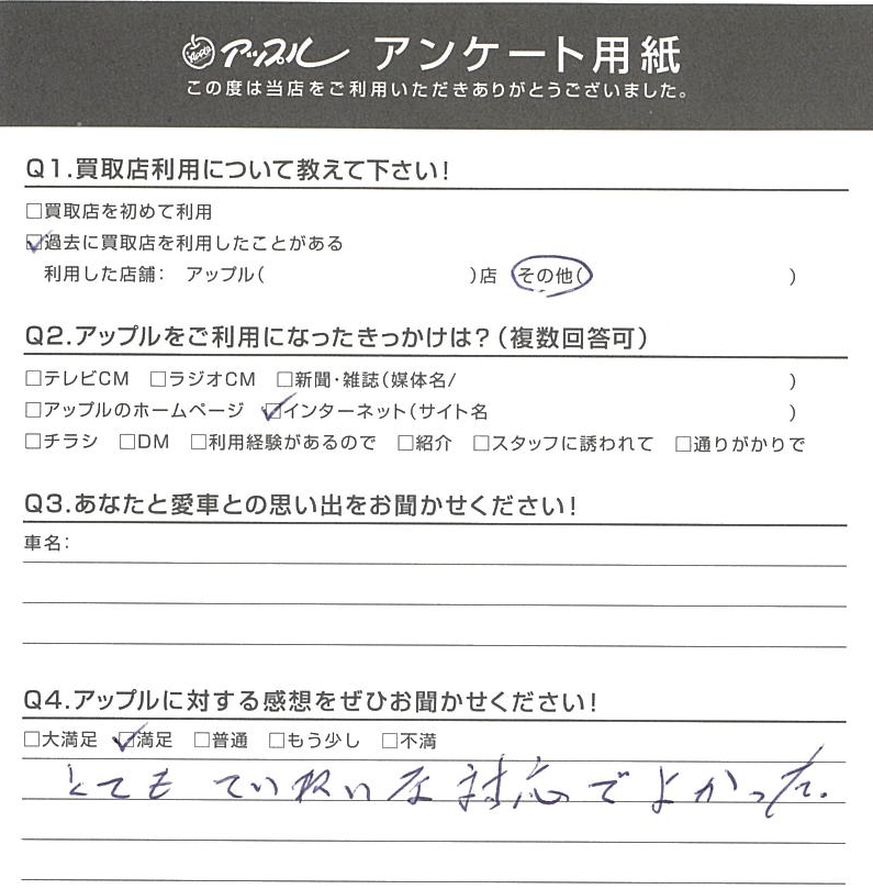 お車のご相談・ 査定だけでもOK! カンタン 入力 30秒 アップルがブランド買取始めました! お電話でも受付中! 受付時間10:00 ~ 19:00 最終受付 : 18時00分 0120-270-003 お車のご相談・ 査定だけでもOK! カンタン 入力 30秒 アップルがブランド買取始めました! お電話でも受付中! 受付時間10:00 ~ 19:00 最終受付 : 18時00分 0120-270-003 アップルがブランド買取始めました! お電話でも受付中! 受付時間10:00 ~ 19:00 最終受付 : 18時00分 0120-270-003 店舗情報 在庫車 スタッフ紹介 ブログ お客様の声 キャンペーン 無料査定 click お客様の声 ご記入日: 2020/11/24 秋田県 匿名様 車名:マツダ ベリーサ ☆アップルに対する感想をぜひお聞かせください!! 満足度:★★★★ とてもていねいな対応でよかった。 前へ 次へ お客様の声一覧を見る