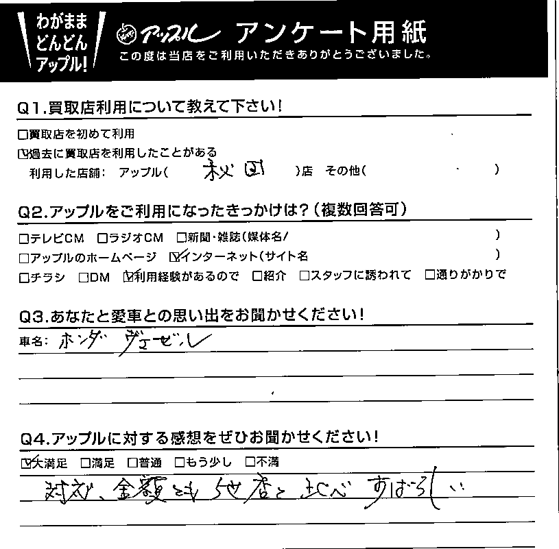 お車のご相談・ 査定だけでもOK! カンタン 入力 30秒 アップルがブランド買取始めました! お電話でも受付中! 受付時間10:00 ~ 19:00 最終受付 : 18時00分 0120-270-003 お車のご相談・ 査定だけでもOK! カンタン 入力 30秒 アップルがブランド買取始めました! お電話でも受付中! 受付時間10:00 ~ 19:00 最終受付 : 18時00分 0120-270-003 アップルがブランド買取始めました! お電話でも受付中! 受付時間10:00 ~ 19:00 最終受付 : 18時00分 0120-270-003 店舗情報 在庫車 スタッフ紹介 ブログ お客様の声 キャンペーン 無料査定 click お客様の声 ご記入日: 2021/01/24 秋田県 匿名様 車名:ホンダ ヴェゼル ☆アップルに対する感想をぜひお聞かせください!! 満足度:★★★★★ 対応、金額とも他店と比べすばらしい 前へ 次へ お客様の声一覧を見る